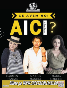 Comedie (premieră) „Ce avem noi aici?” de Lia Bugnar, distribuție: Carmen Tănase, Marius Manole, Maria Obretin. Regie Lia Bugnar.