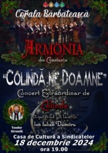 In data de 18 decembrie 2024, ora 19:00, va avea loc la Casa de Cultura a Sindicatelor „Nicolae Iorga” Botosani concertul extraordinar de colinde sustinut de CORUL ARMONIA din Constanta, dirijor, Arhid. Lect. Univ. Dr. Ion Iulian Dumitru. In dechidere va evolua, cu un program de colinde traditionale, tanarul interpret de muzica populara TEODOR GIREADA.