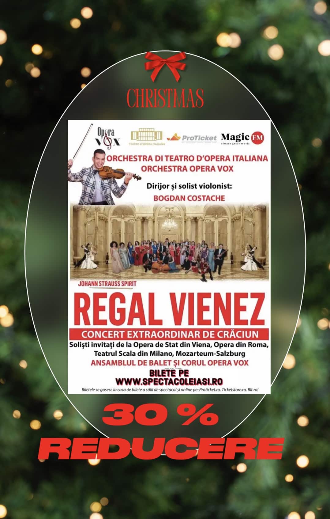 Conducerea muzicala a spectacolului va fi asigurată de tânărul dirijor și solist violinist BOGDAN COSTACHE și, astfel, soliștii și instrumentiștii vienezi, italieni, germani, vor evolua sub bagheta unuia dintre cei mai talentați conducători de orchestra ai tinerei generații, născut în România! Prezența lui BOGDAN COSTACHE în programul REGALULUI VIENEZ de anul acesta se datorează dumneavoastră, publicului spectator care, după spectacolul cu “Trei3 Tenori Italieni” v-ați arătat impresionați de prestația lui, dorindu-va să-l revedeți cât mai curând. Astfel, spectacolul va fi unul interactiv, dirijat “cu vioara în mâna” după modelul lui JOHANN STRAUSS sau, mai nou, a lui ANDRE RIEU.