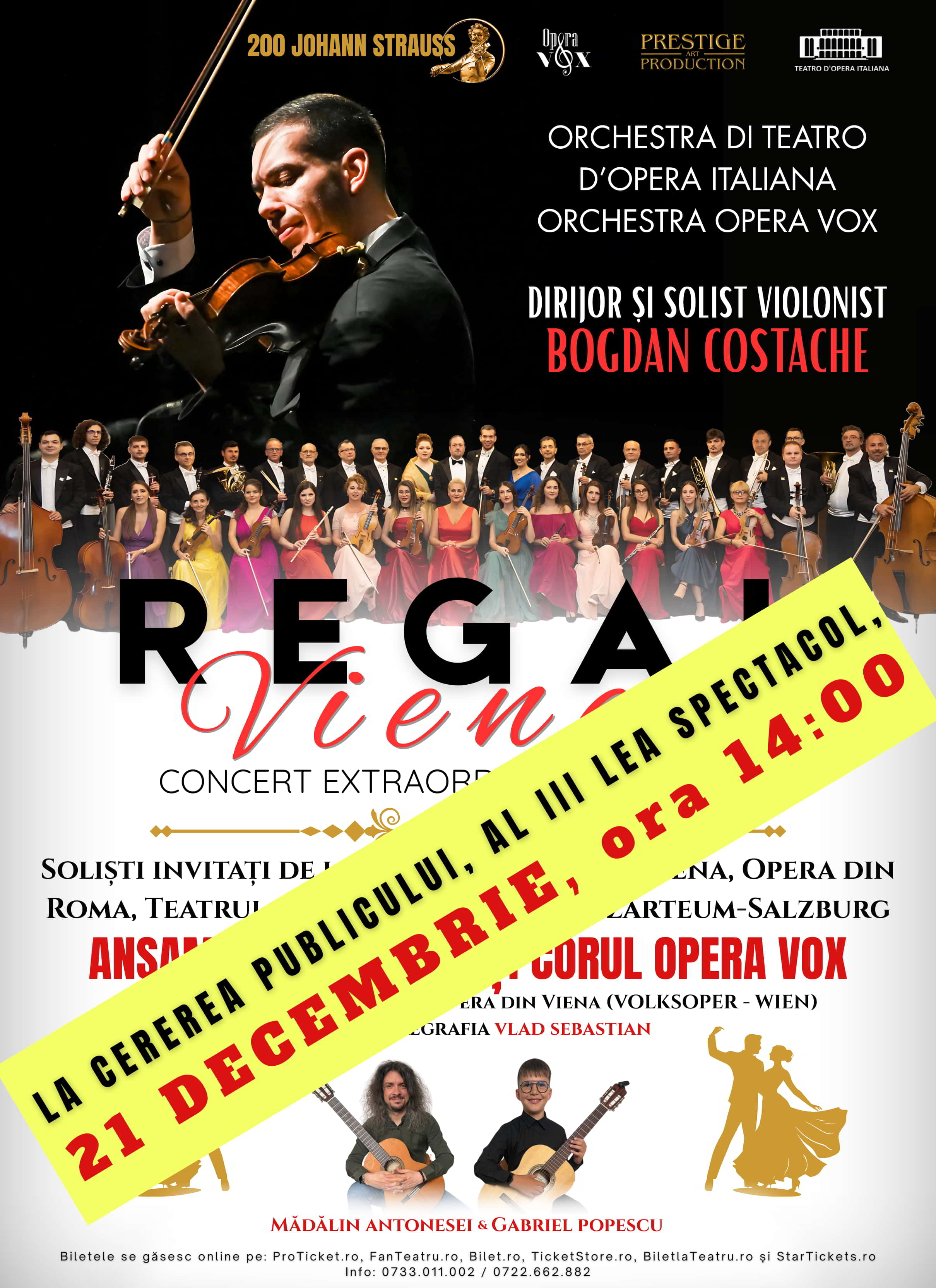 Conducerea muzicală a spectacolului va fi asigurată de tânărul dirijor și solist violinist BOGDAN COSTACHE și, astfel, soliștii și instrumentiștii invitați din Viena, Italia, Elveția, Germania, vor evolua sub bagheta unuia dintre cei mai talentați conducători de orchestră ai tinerei generații, născut în România! Prezența lui BOGDAN COSTACHE în programul REGALULUI VIENEZ din acest an se datorează dumneavoastră, publicului spectator care îl îndrăgiți deja atât de mult și v-ați arătat impresionați de prestația lui, dorindu-vă să-l revedeți cât mai curând. Astfel, spectacolul va fi unul interactiv, dirijat „cu vioara în mână” după modelul lui JOHANN STRAUSS sau, mai nou, al lui ANDRE RIEU.